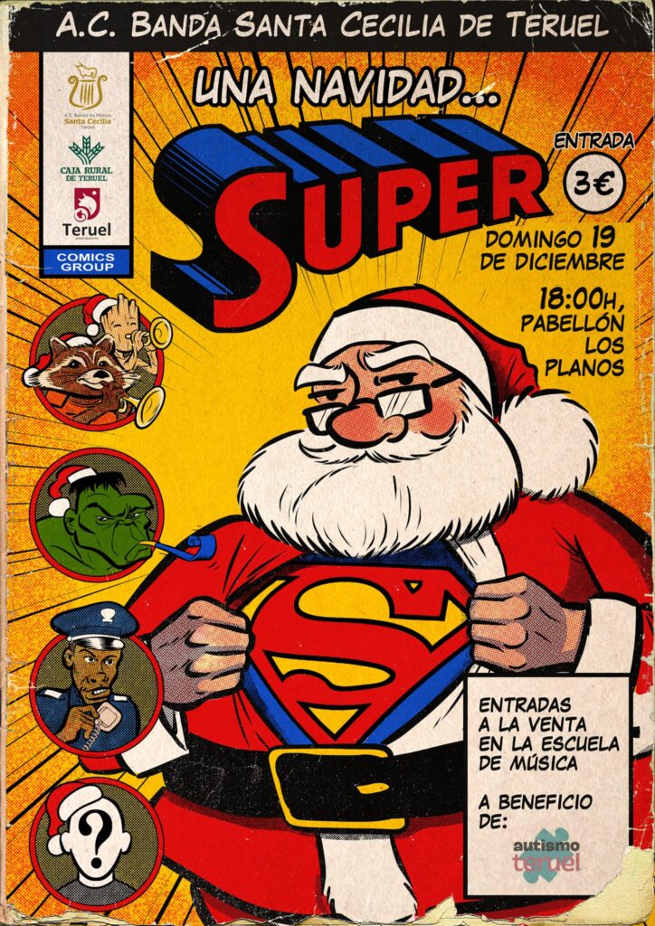 El domingo día 19 de diciembre, se celebrará el Tradicional Concierto de Navidad de la Banda de Música Santa Cecilia de Teruel, que lleva por título «UNA NAVIDAD… SUPER». En esta ocasión, y para garantizar la distancia de seguridad entre los músicos, a la vez que asegurar un aforo cómodo para un millar de personas en pista y gradas cumpliendo con todas las medidas de seguridad, se realizará en el Pabellón Los Planos a las 18.00 horas. Para cumplir con la normativa vigente, se pedirá el certificado Covid a los asistentes mayores de 12 años.