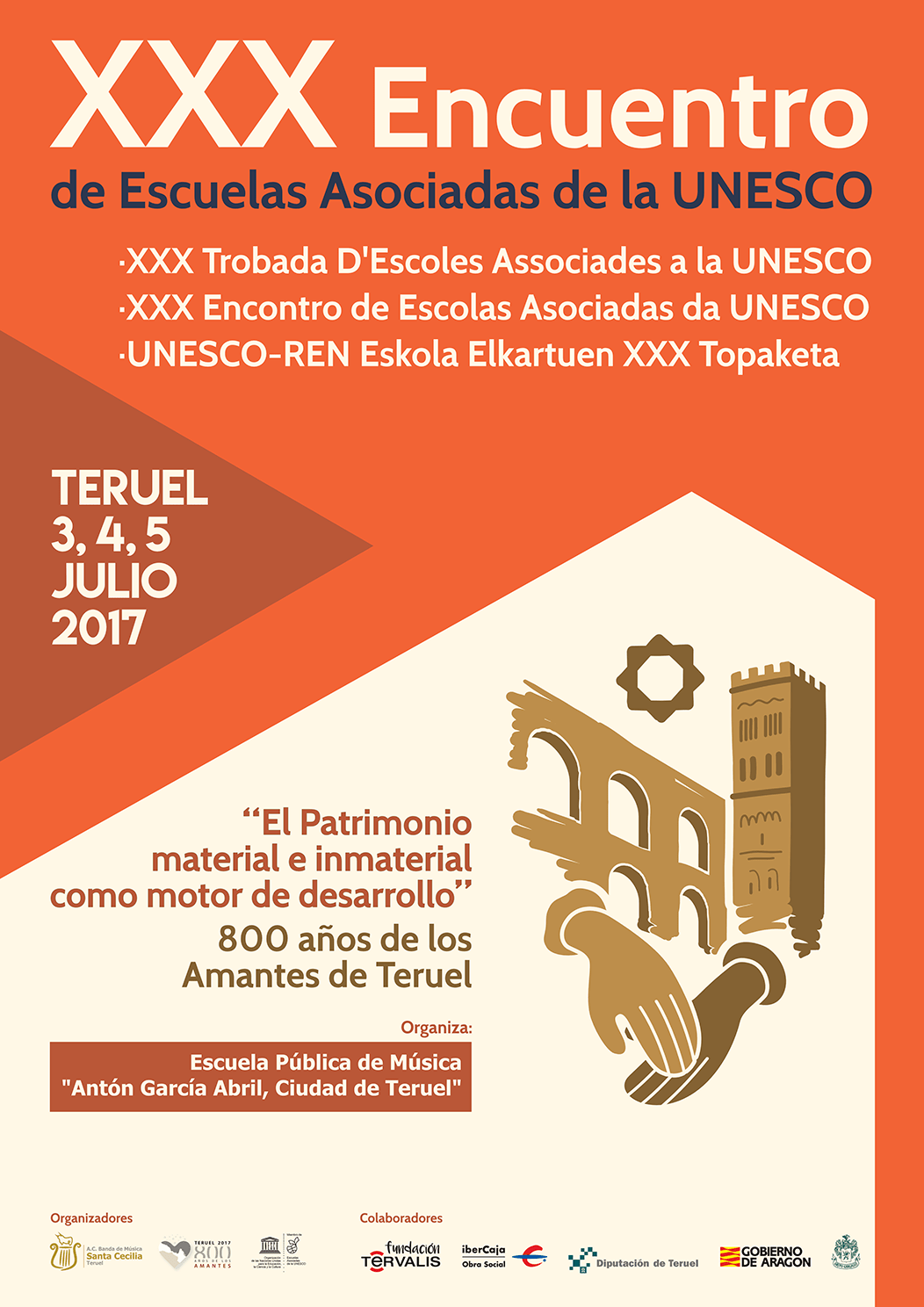 Bajo el título «El Patrimonio Material e Inmaterial como motor de desarrollo – 800 años de los Amantes de Teruel» arranca mañana el XXX Encuentro Estatal de Escuelas Asociadas de la UNESCO, organizado por la Escuela Pública de Música Antón García Abril Ciudad de Teruel. Hasta el día 5 alrededor de 100 profesionales de la educación se darán cita en nuestra ciudad para compartir experiencias, presentar sus trabajos innovadores, debatir e intentar marcar las líneas de trabajo para el próximo curso.