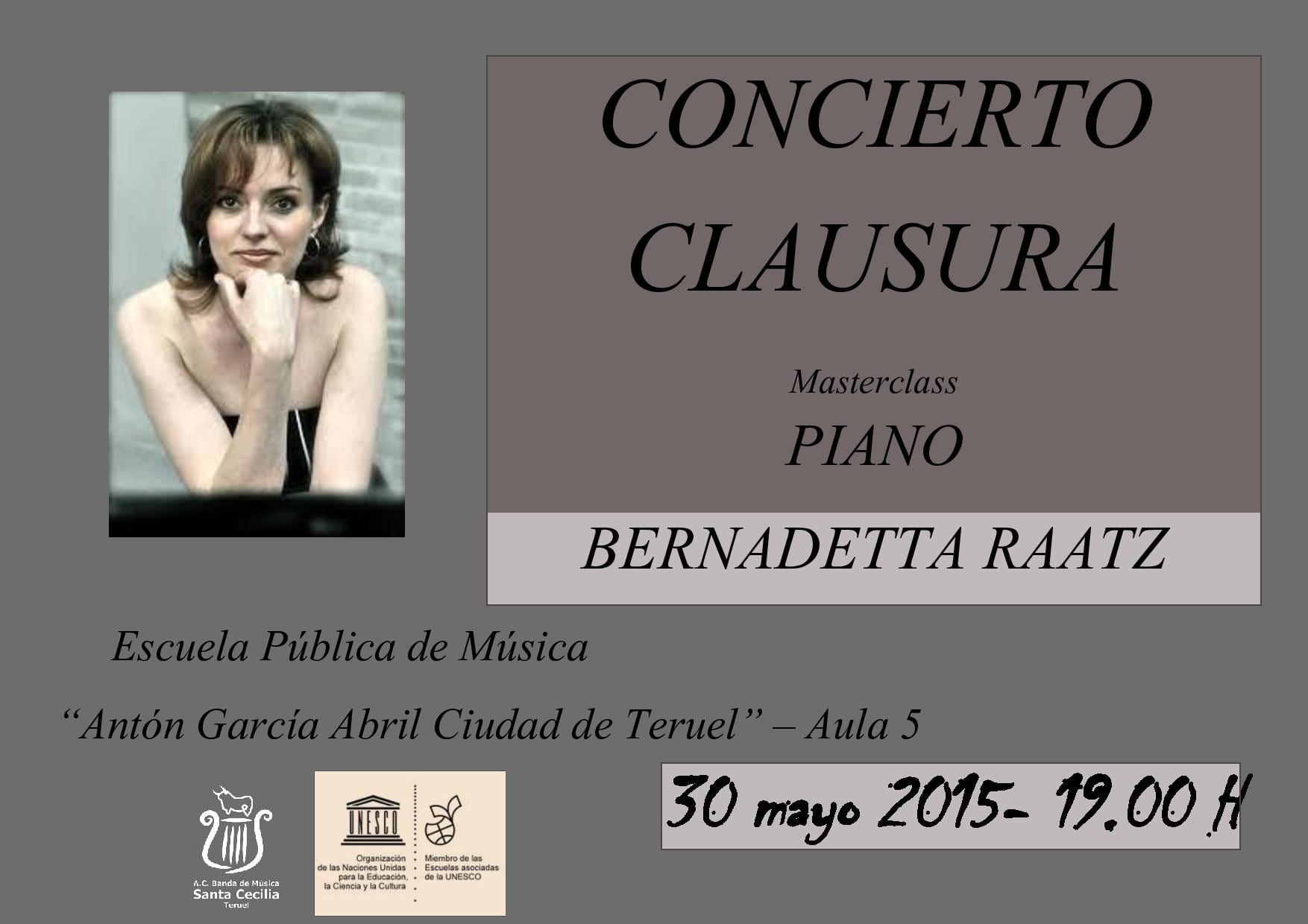A su vez, el sábado se realizará un CONCIERTO CLAUSURA a las 19.00 horas en el Aula 5 de la Escuela de Música “Antón García Abril Ciudad de Teruel” a cargo de Bernadetta Raatz y los alumnos de la masterclass.