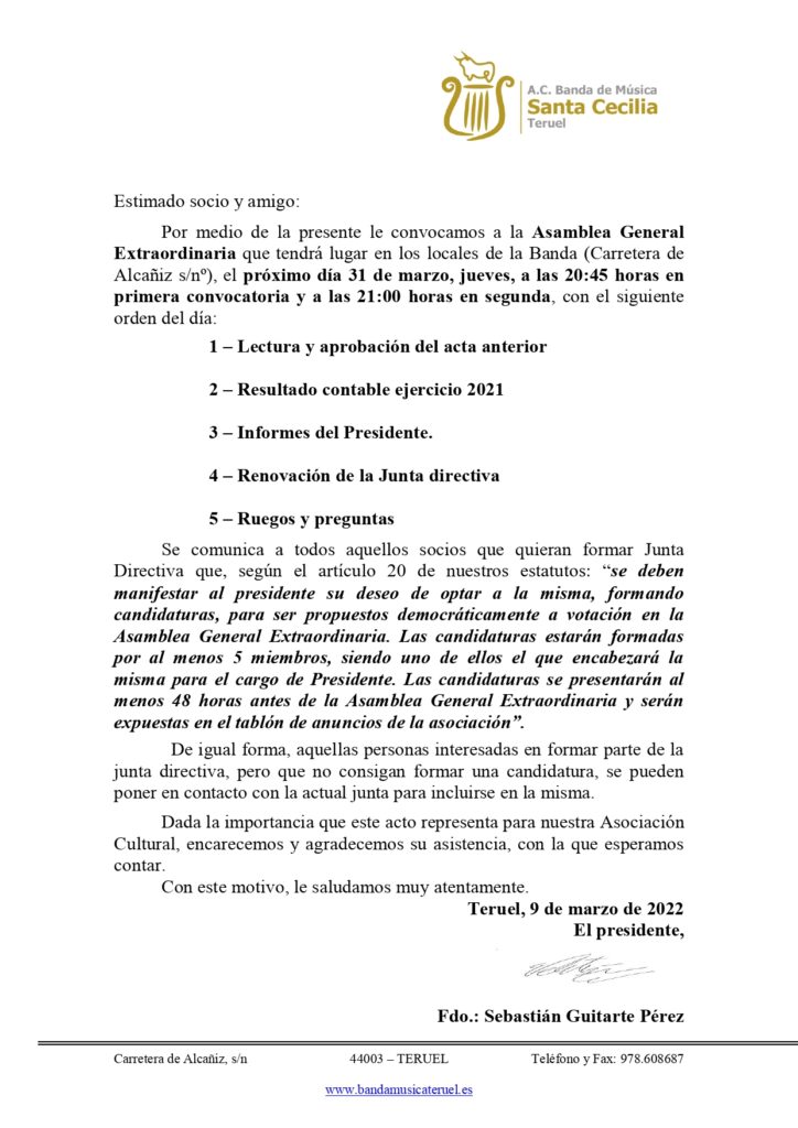 La Asamblea General Extraordinaria tendrá lugar en los locales de la Asociación Cultural Banda de Música «Santa Cecilia» de Teruel (Carretera de Alcañiz s/nº), el próximo día 31 de marzo, jueves, a las 20:45 horas en primera convocatoria y a las 21:00 horas en segunda, con el siguiente orden del día: