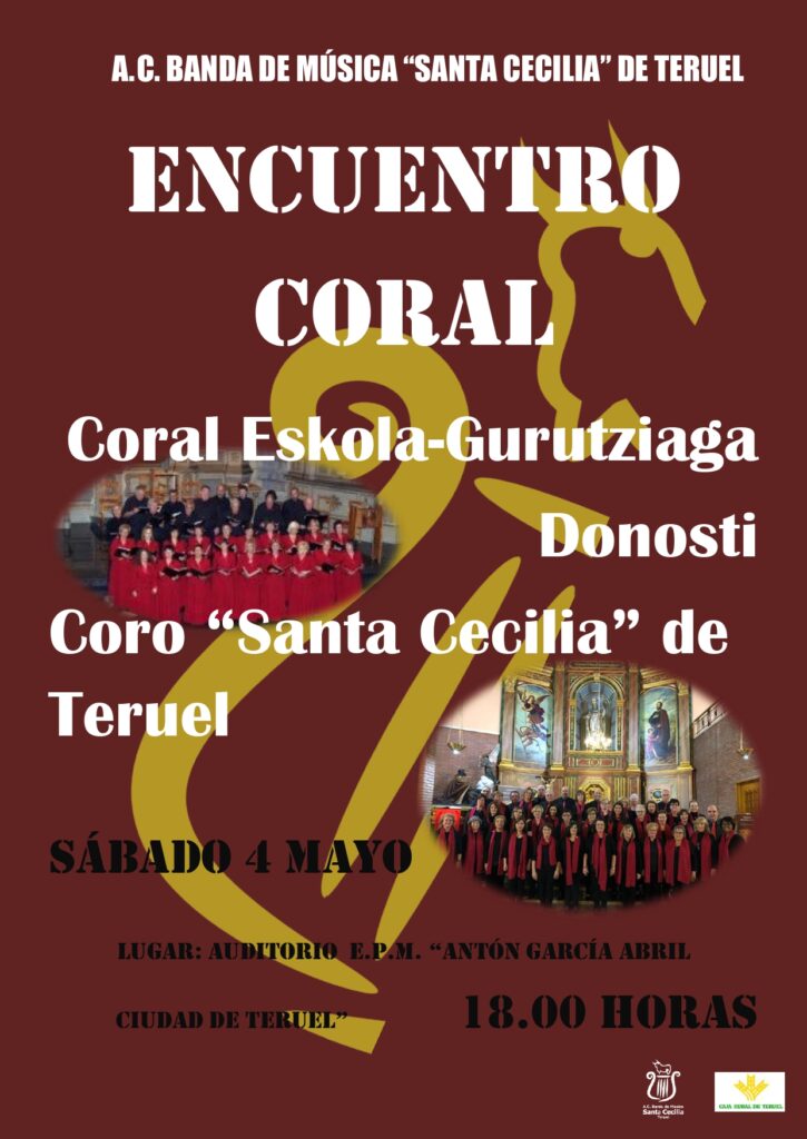 Y, por otro lado, el día 4 de mayo, sábado, el Coro «Santa Cecilia» de Teruel actuará en el Encuentro de Corales, junto a la Coral «Eskola-Gurutziaga» de San Sebastián, que hemos organizado desde la Asociación. La cita será en el Auditorio de la Escuela Pública de Música «Antón García Abril Ciudad de Teruel» a las 18.00 horas. Entrada libre.