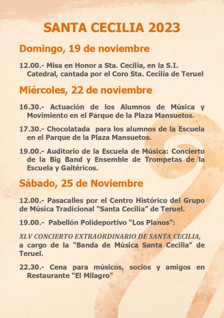 Se acerca Santa Cecilia, patrona de los músicos, y en torno a este día tan especial se han programado desde la Asociación Cultural «Banda de Música Santa Cecilia de Teruel» y desde la Escuela Pública de Música «Antón García Abril Ciudad de Teruel» una serie de actividades.
