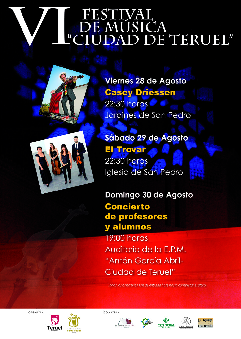 A partir del jueves, 28 de agosto, y hasta el domingo, 30 de agosto, clases, actividades y conciertos se van a realizar. Un completo programa que este año tiene mucha calidad, prestigiosos profesores y tres conciertos de lujo, uno de ellos en los Jardines de San Pedro, otro en la Iglesia de San Pedro y el concierto final en el Auditorio de la Escuela Pública de Música «Antón García Abril Ciudad de Teruel». Todos ellos con entrada gratuita…. Este año podemos ver al prestigioso violinista americano Casey Driessen ( http://caseydriessen.com/ ) y al Ensemble «El Trovar»…….