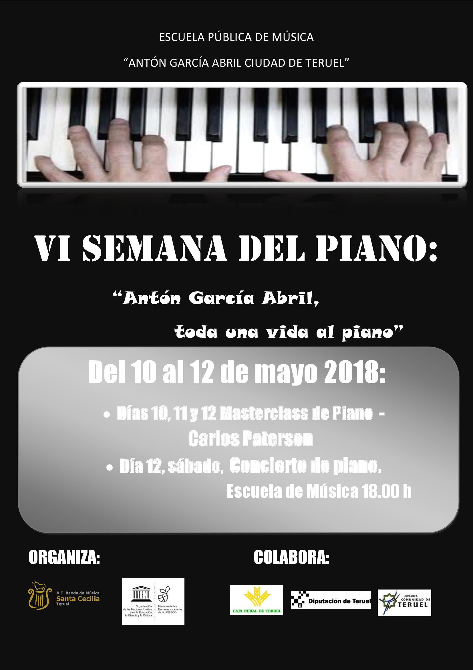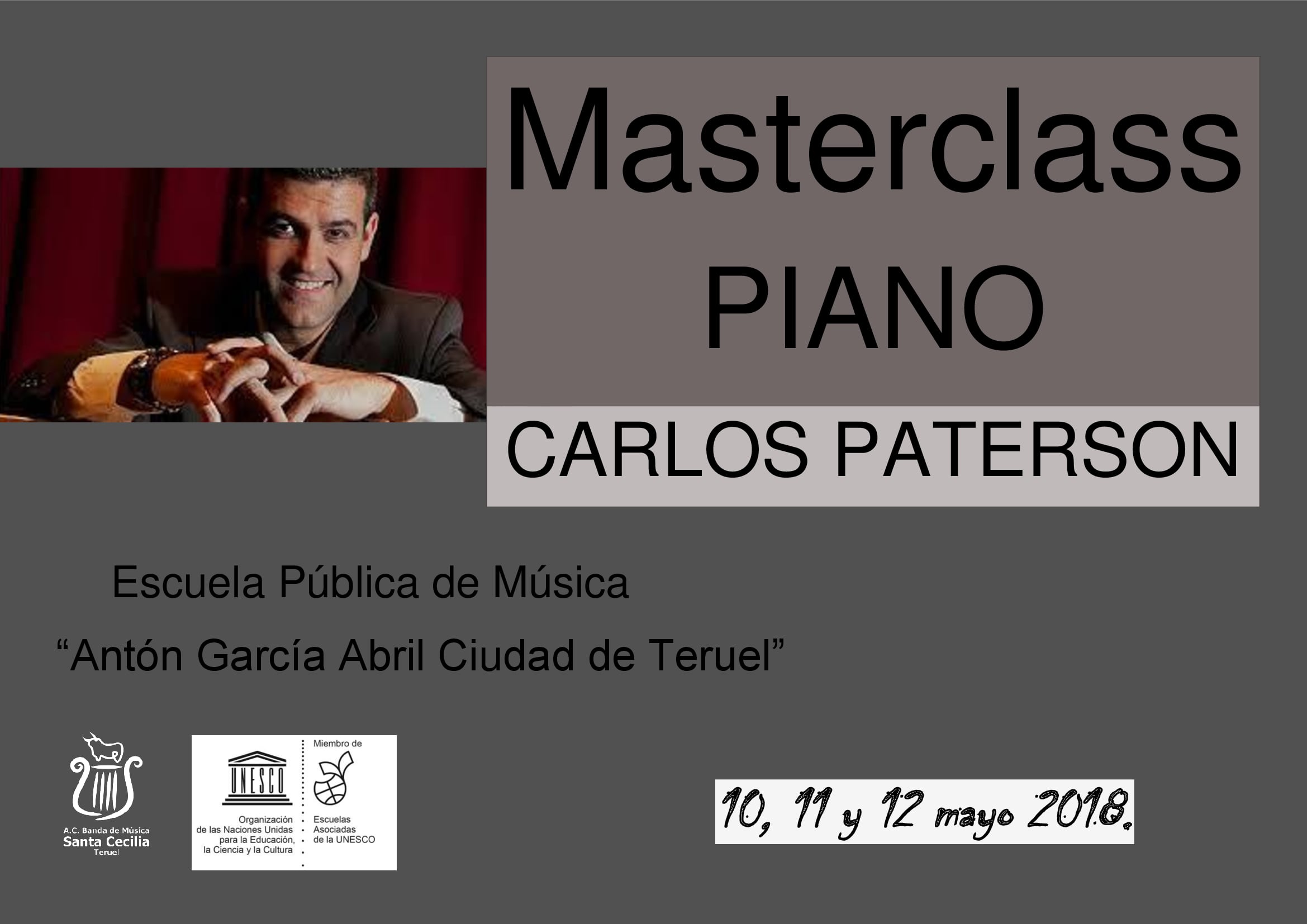 - Días 10, 11 y 12, jueves, viernes y sábado, Masterclass de piano a cargo del pianista Carlos Paterson. El turolense es Catedrático de Órgano del Conservatorio Superior de Música de Valencia, Profesor de Piano en el Instituto de Artes Musicales de Valencia, Compositor y Productor Musical. A los veinte años obtiene los títulos de profesor de piano, órgano y solfeo con las máximas calificaciones, siendo al mismo tiempo galardonado con el “Premio especial de piano” en conmemoración del XX aniversario del Instituto Musical Turolense. En piano ha sido discípulo de grandes profesores como Nairi Grigorian y Anna Jastrzebska. En Órgano ha tenido como maestros a Montserrat Torrent, José Luís González Uriol, Jan Willem Jansen, en clavicémbalo a Olivier Baumont, y en dirección coral a Guido Iotti. Todos ellos de reconocido prestigio internacional. Con éstos últimos se ha especializado en el estudio e interpretación de la música antigua. Durante los últimos años su actividad concertística se ha desarrollado tanto por toda la geografía española como por gran parte de Europa: Italia, Francia, Alemania, Austria, Suiza y Reino Unido.