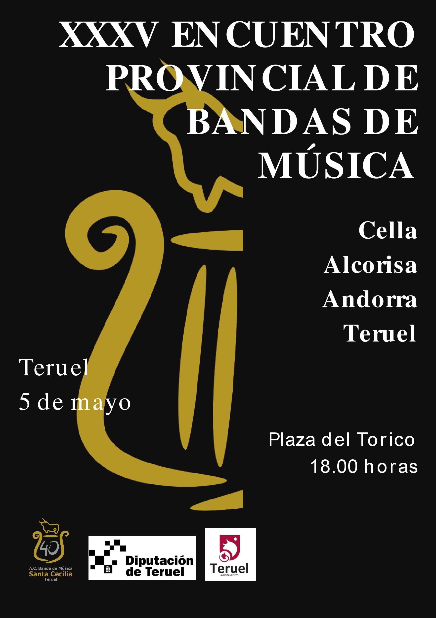 Este sábado, día 5 de mayo, se va a realizar el XXXV Encuentro Provincial de Bandas de Música que organiza la Diputación Provincial de Teruel, la A.C. Banda de Música «Santa Cecilia» de Teruel y el Ayuntamiento de la ciudad. En esta ocasión participan las bandas de música de Cella, Andorra, Alcorisa y Teruel.